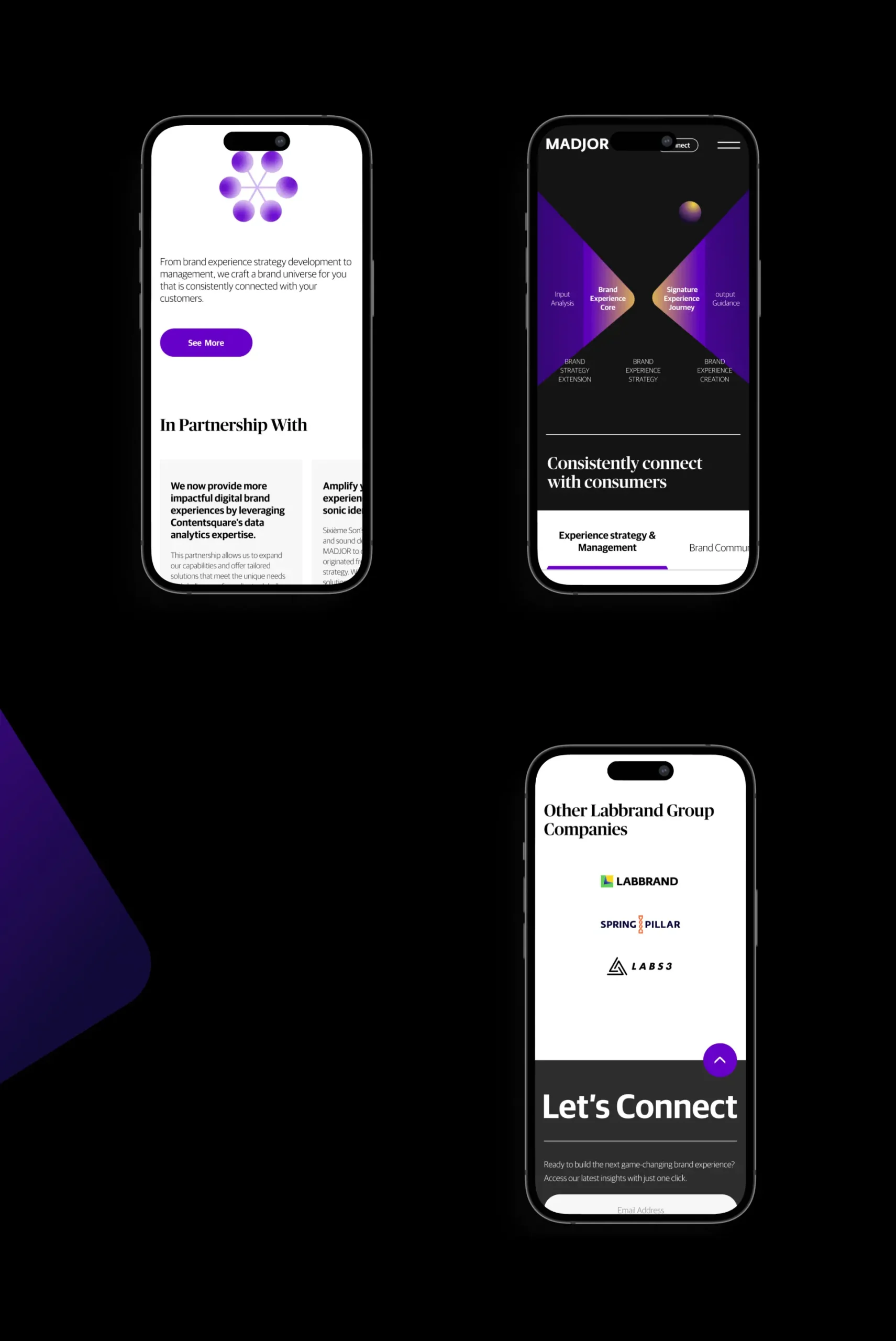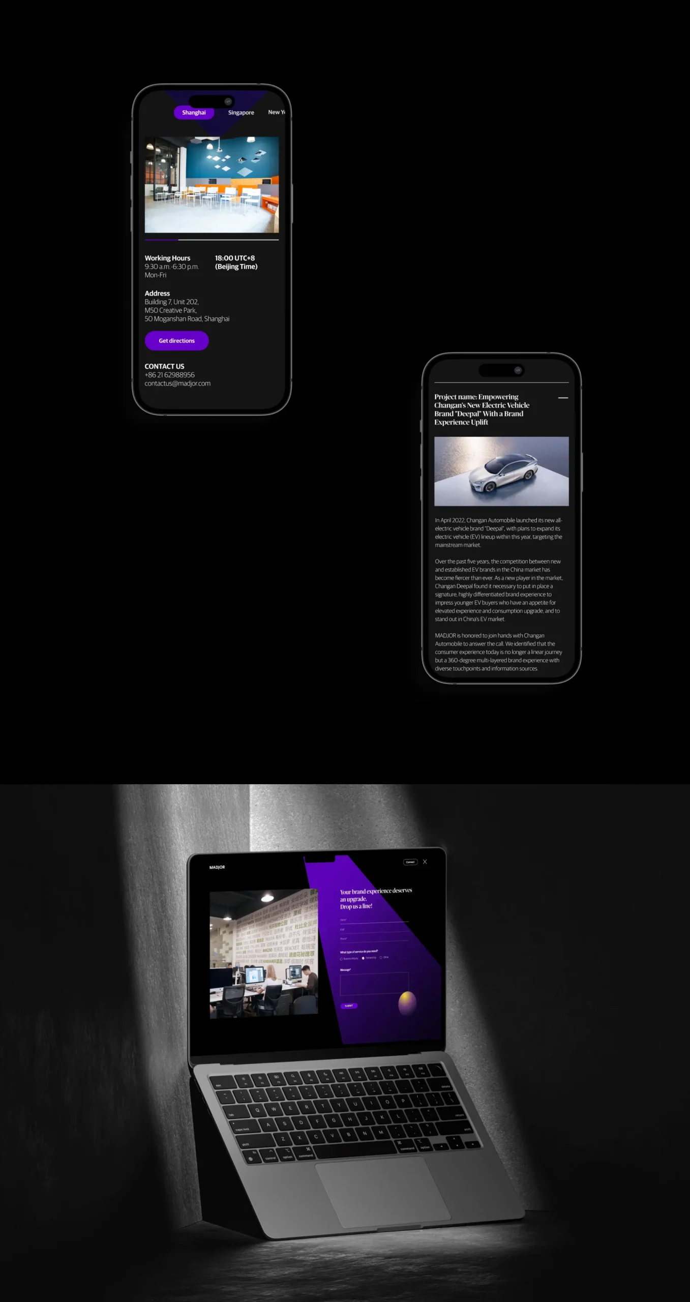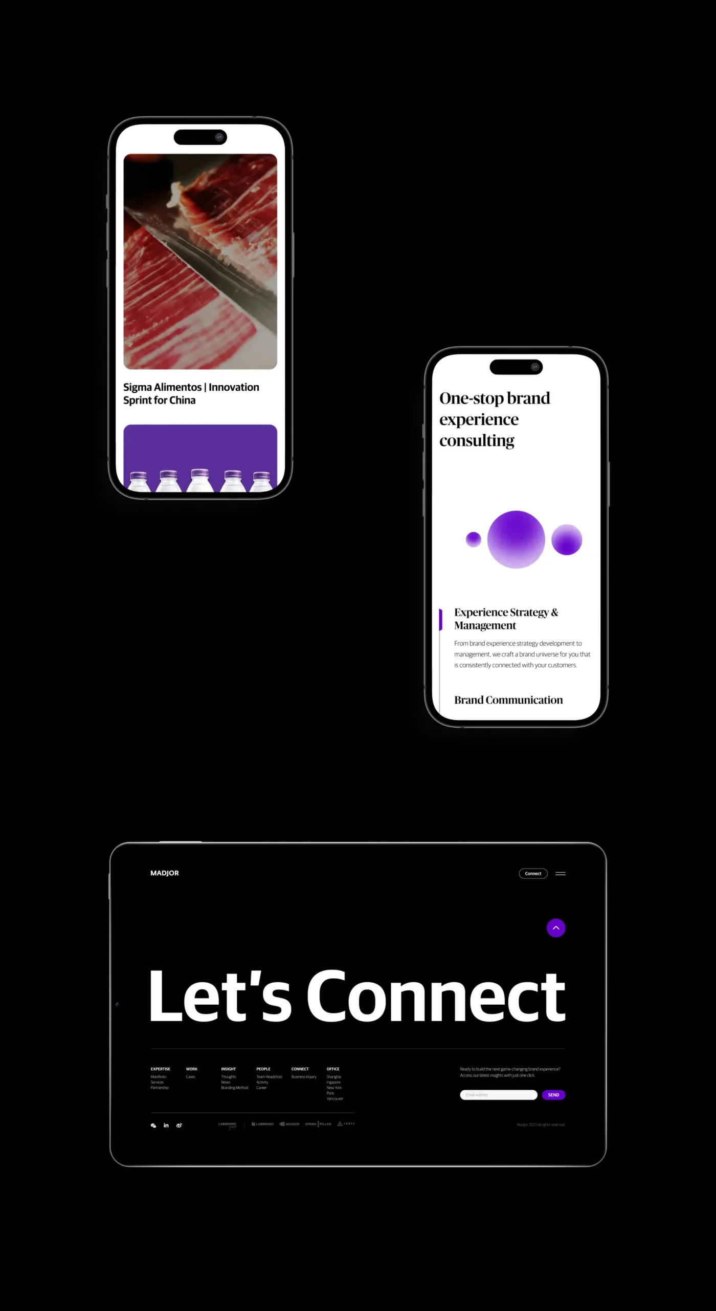 我们为Madjor打造了一个交互体验极佳的品牌网站,突出展示了他们在品牌体验咨询领域的专业知识和独特交互方式。我们为Madjor创立完整的交互与视觉,从电脑端到手机端都提供了绝佳的用户体验,让客户和潜在合作伙伴更深入地了解Madjor所提供的服务。通过这次合作,我们成功地为Madjor树立了更清晰的品牌定位,期待未来他们在品牌体验领域取得更多新的高度。
